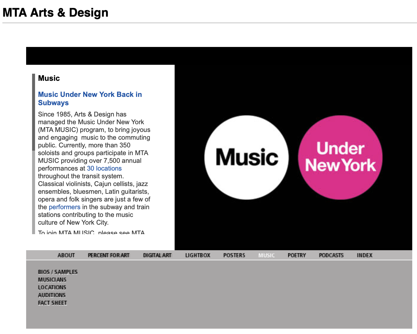 MTA MUSIC (Music Under New York) is one of the many visual and performing arts programs administered by MTA Arts & Design that enhances the transit environment for customers. MTA MUSIC began as a pilot program in 1985 and became an Arts & Design program in January 1987, with the enthusiastic support of the commuting public.